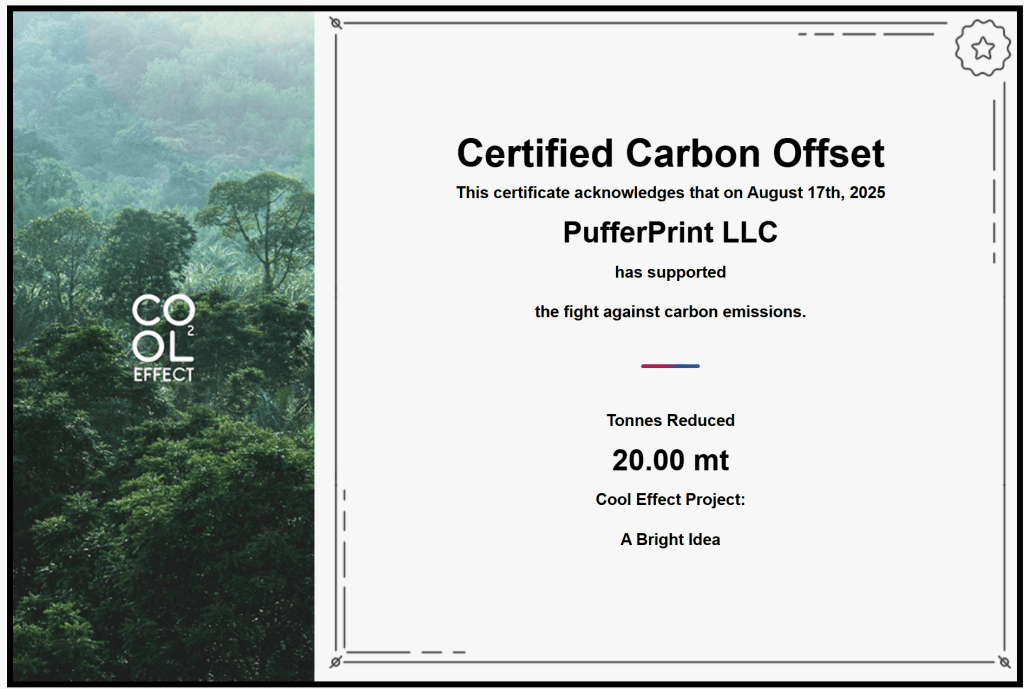 Overall, we believe that any customer choosing PufferPrint is also choosing to live their values by working with a company that strives to support a livable and beautiful planet for future generations. We do this in two key ways…